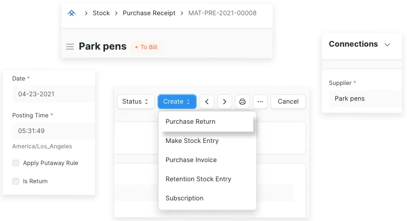 Seamlessly with linked sales/purchase returns, automated stock updates, and accounting reconciliation.