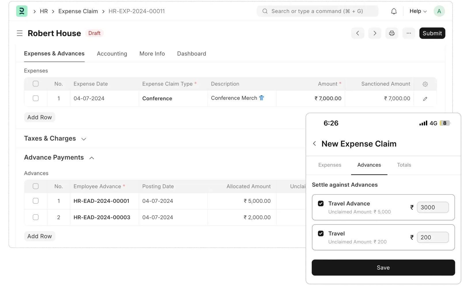 Streamline everything from advance payouts to claim tracking and uncover helpful insights—keeping your accounting perfectly in sync with frappe HR
