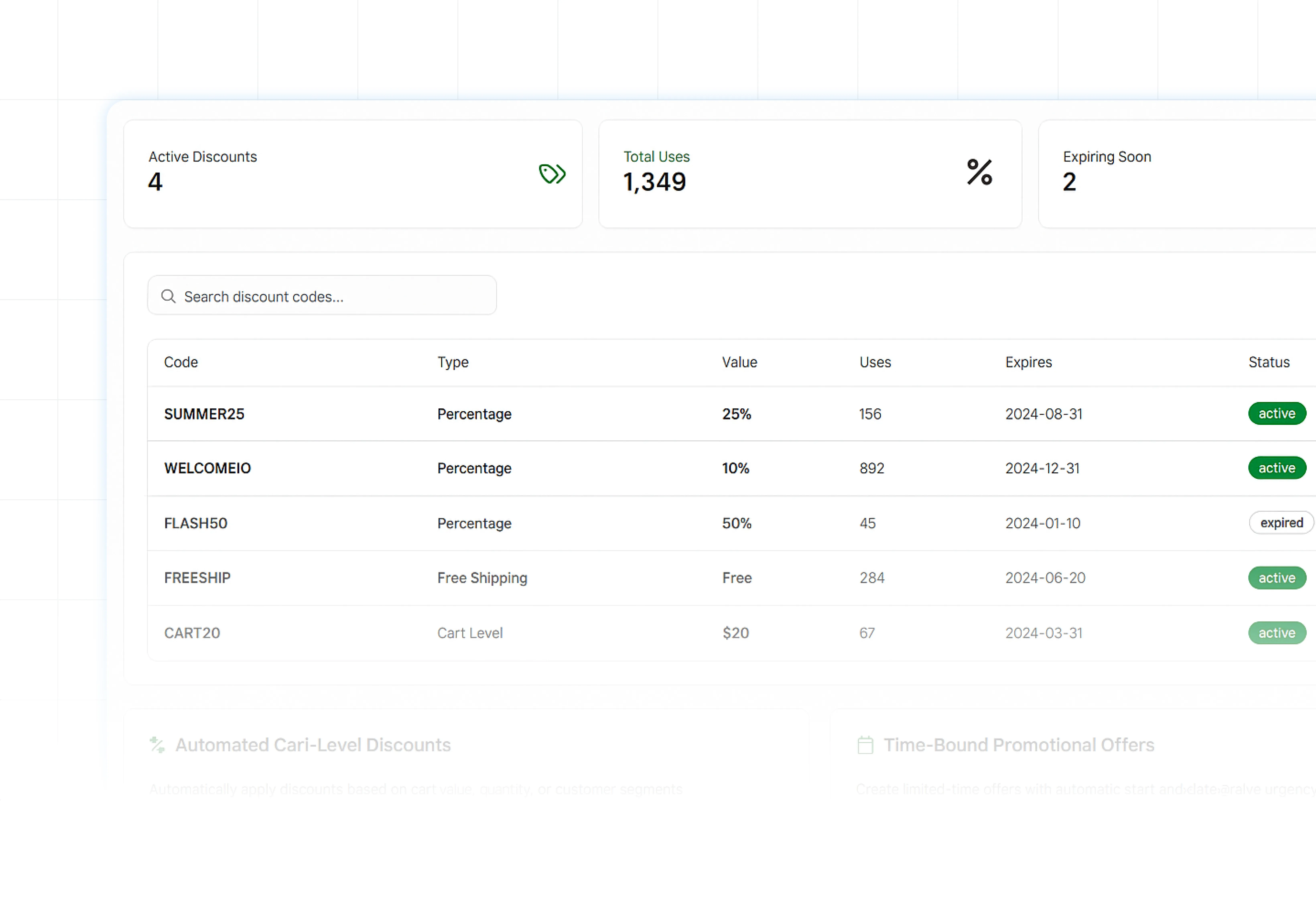 Create flexible discounts, coupons, and promotions with detailed rules and usage tracking.
