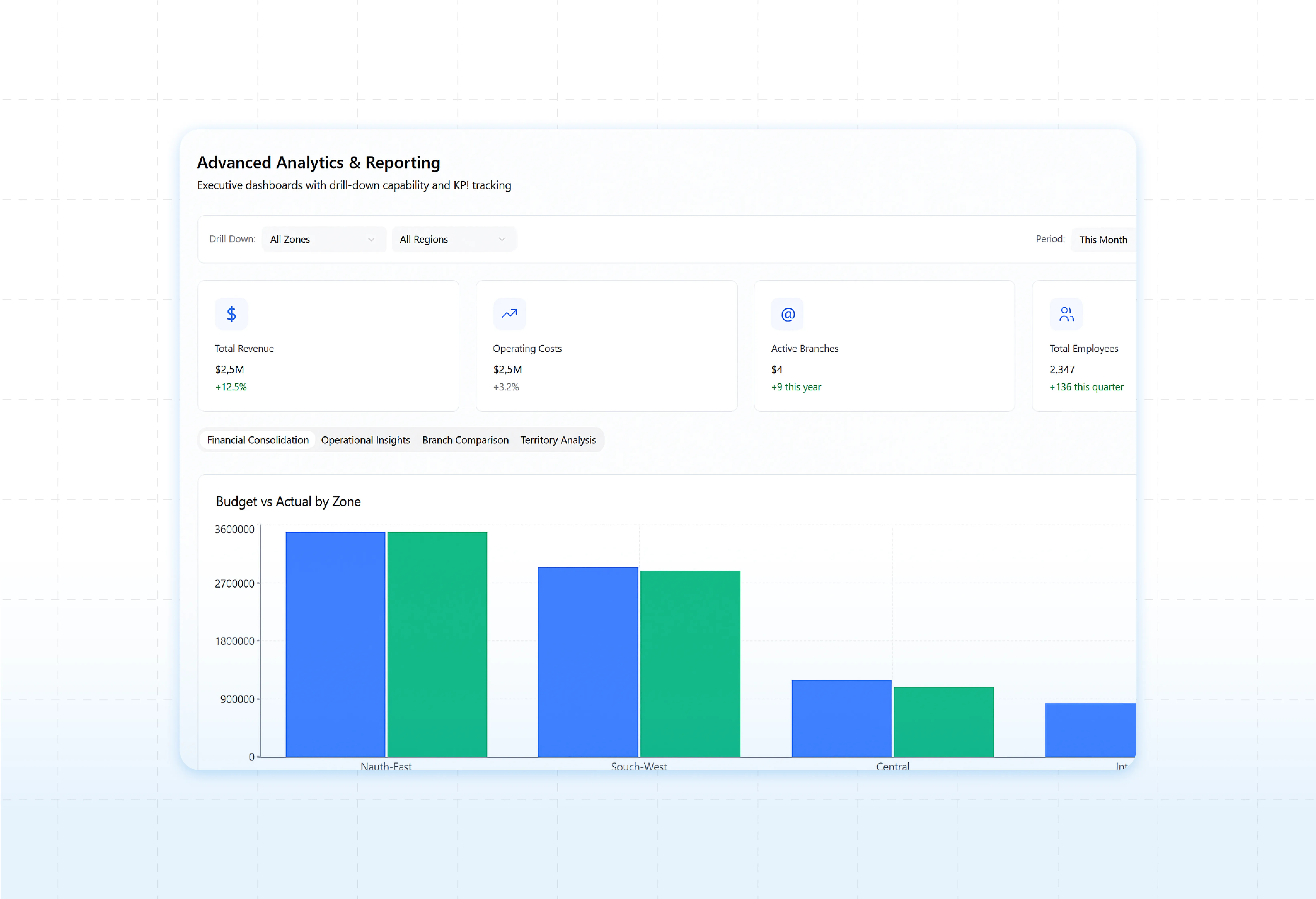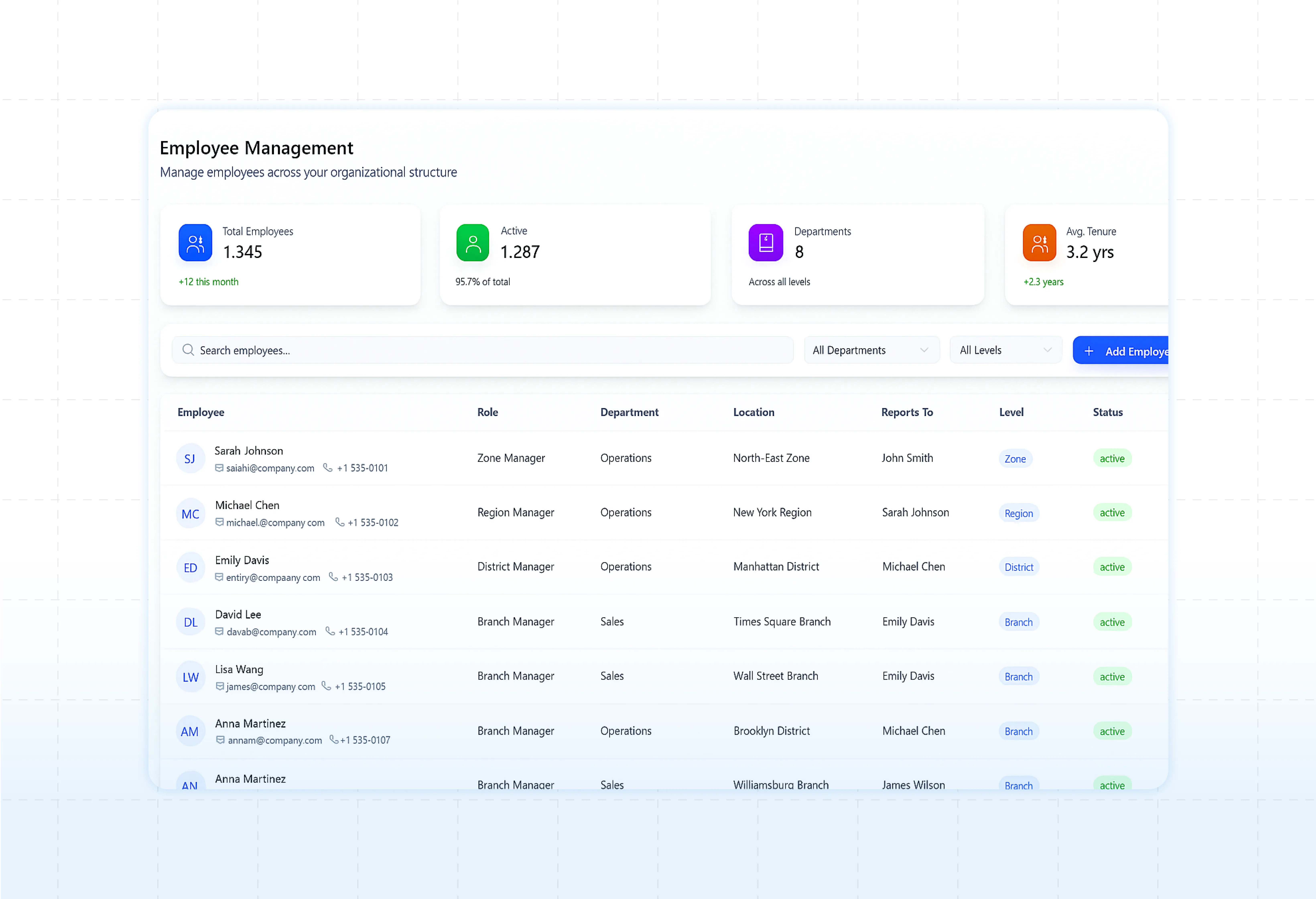 Define branches, zones, departments, and reporting lines — all managed centrally and connected with ERPNext.