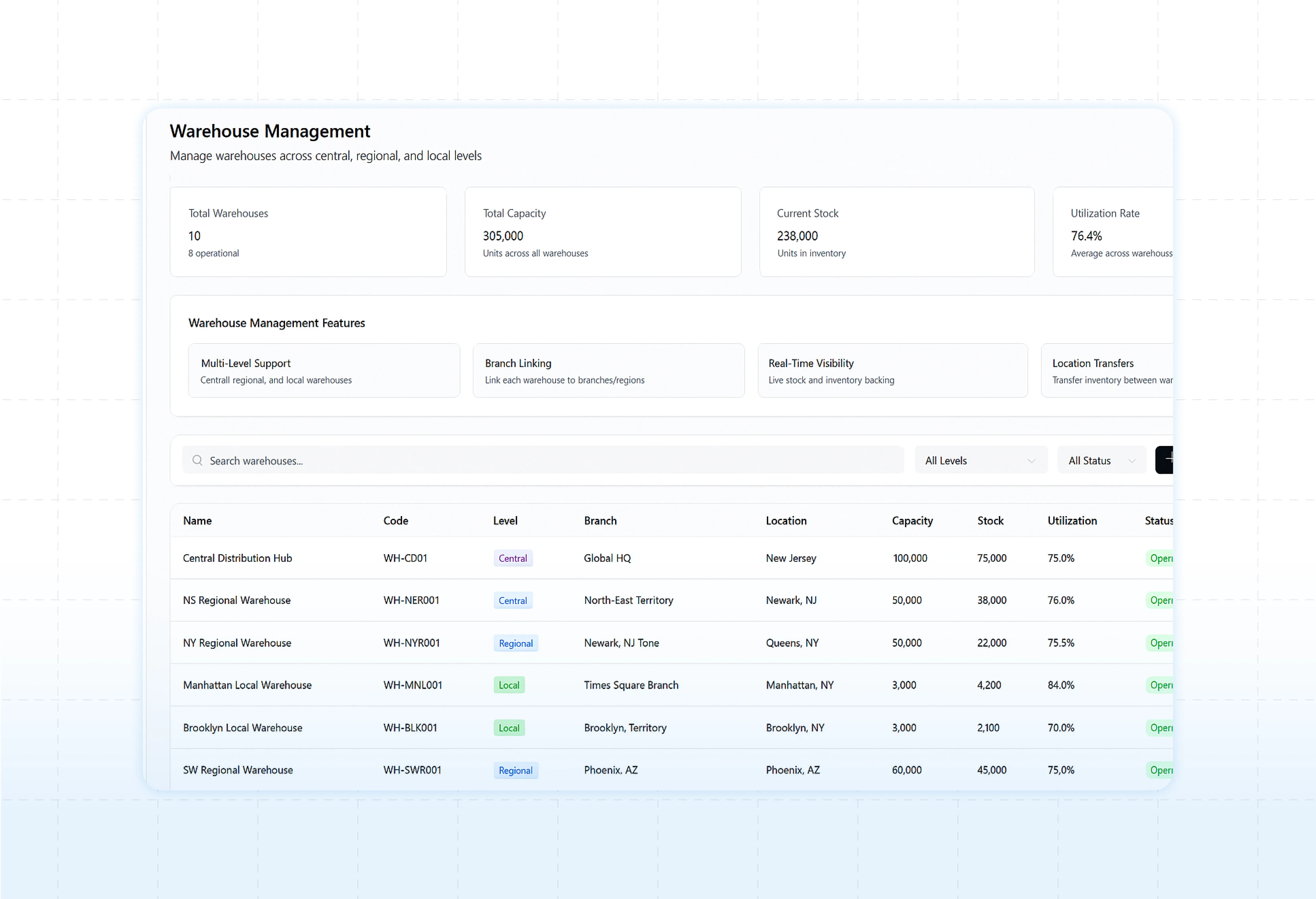 Central, regional, and local warehouses are linked to branches for real-time inventory tracking.