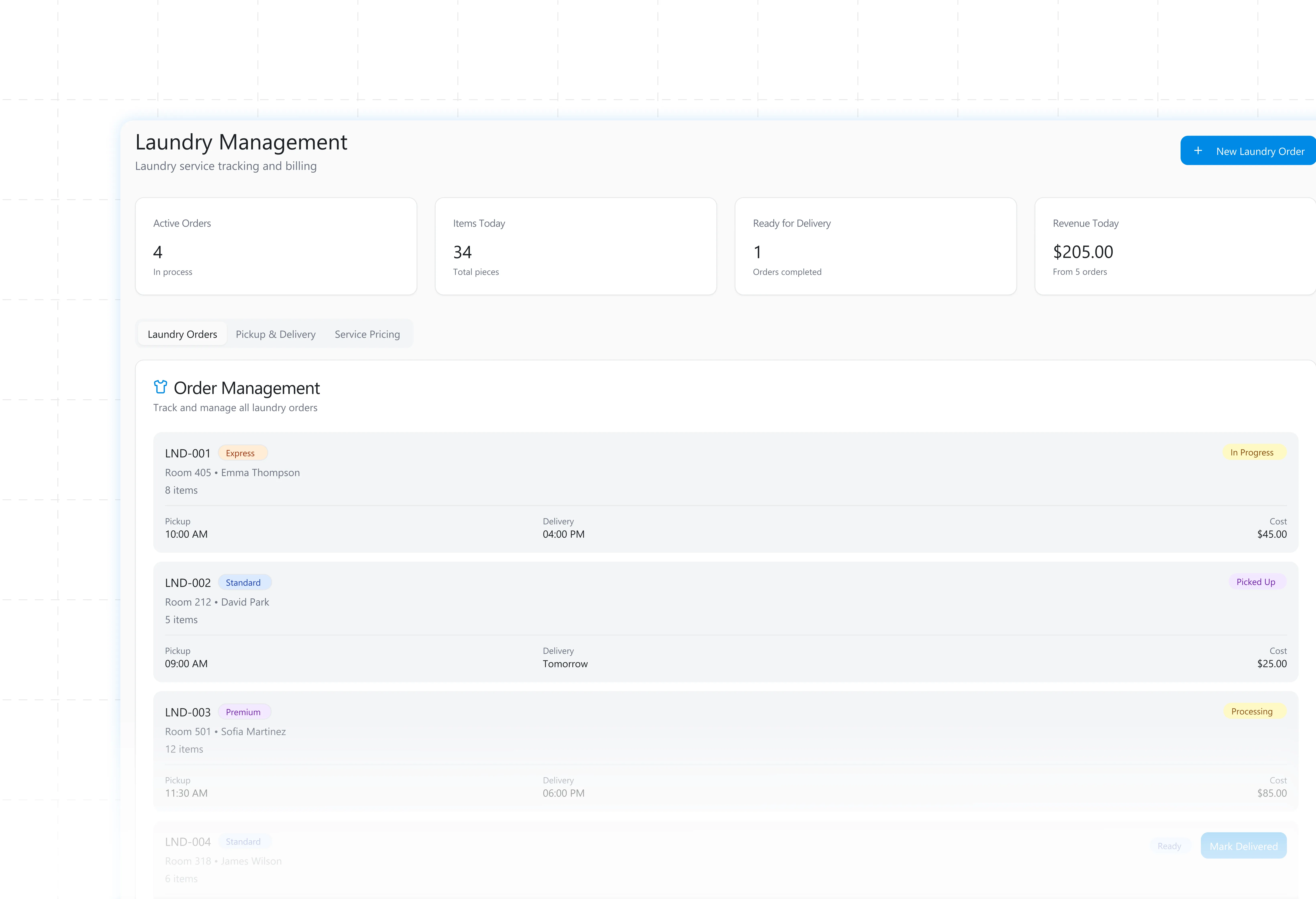 Monitor daily laundry status and service completion.