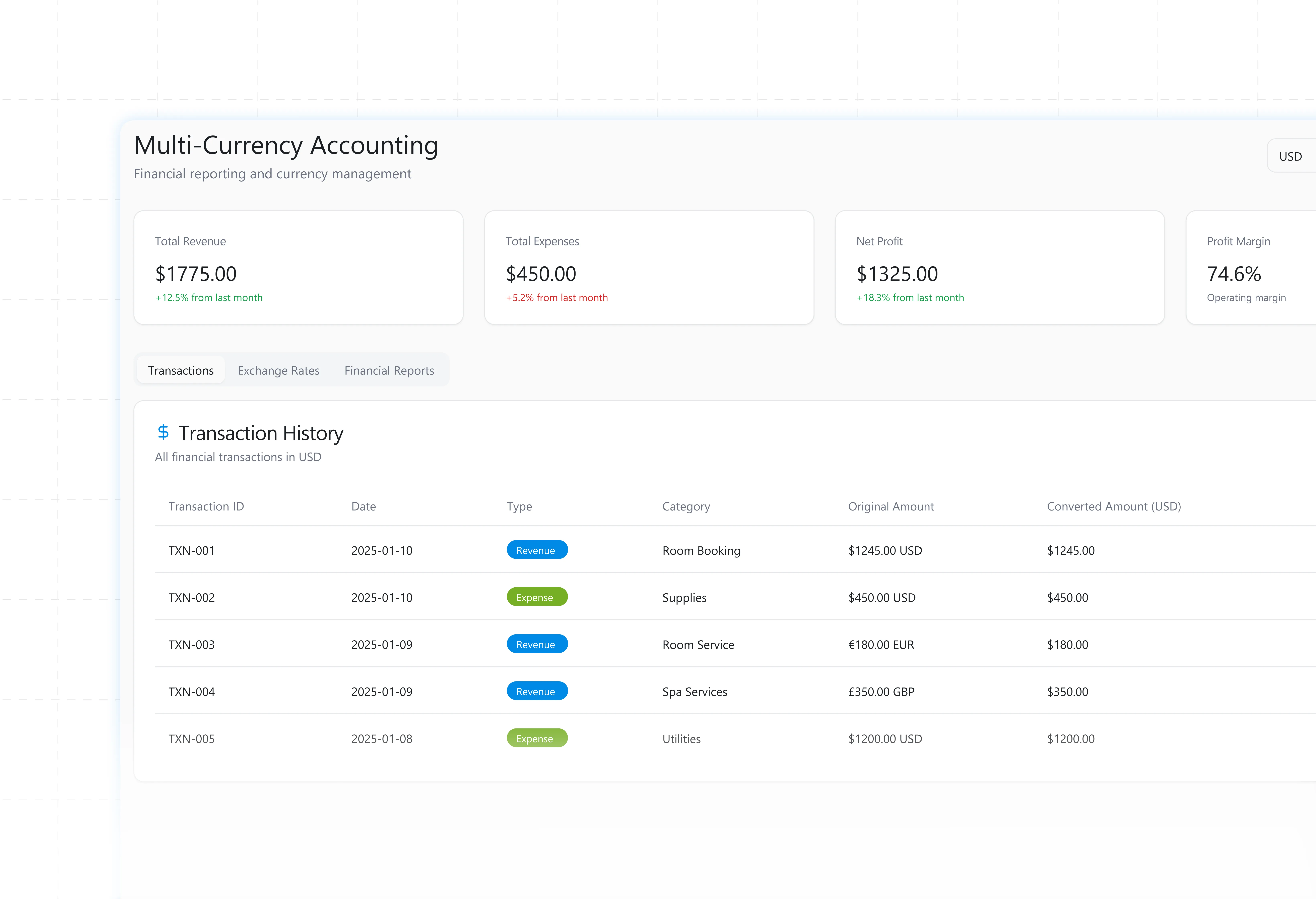 Manage transactions with real-time exchange rate updates.