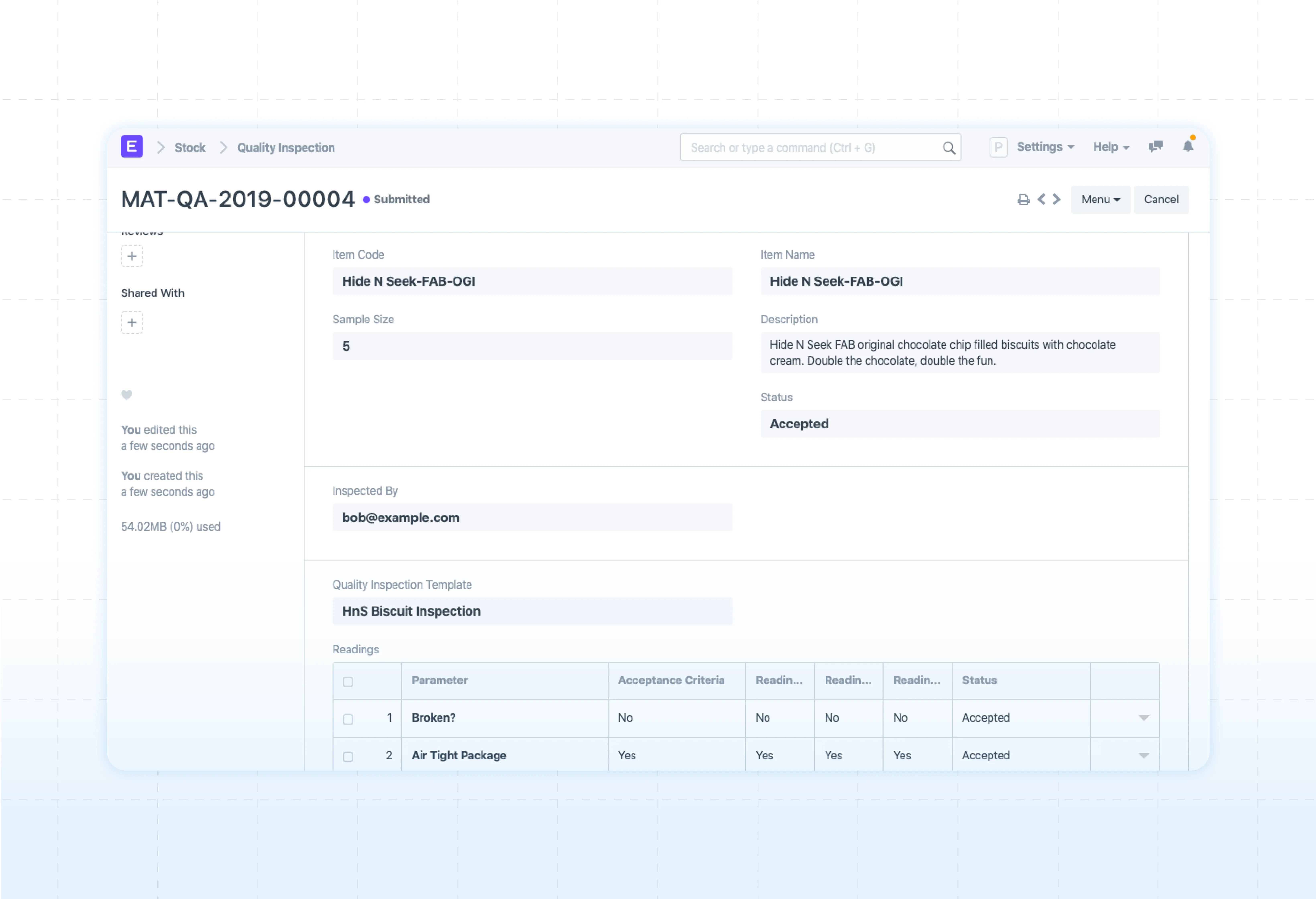 Implement ERPNext quality inspection features to ensure correct stock moves in and out of warehouses. Link transactions to quality inspections, select sample sizes, enter readings, and decide whether to accept or reject items during your wholesale distribution process.