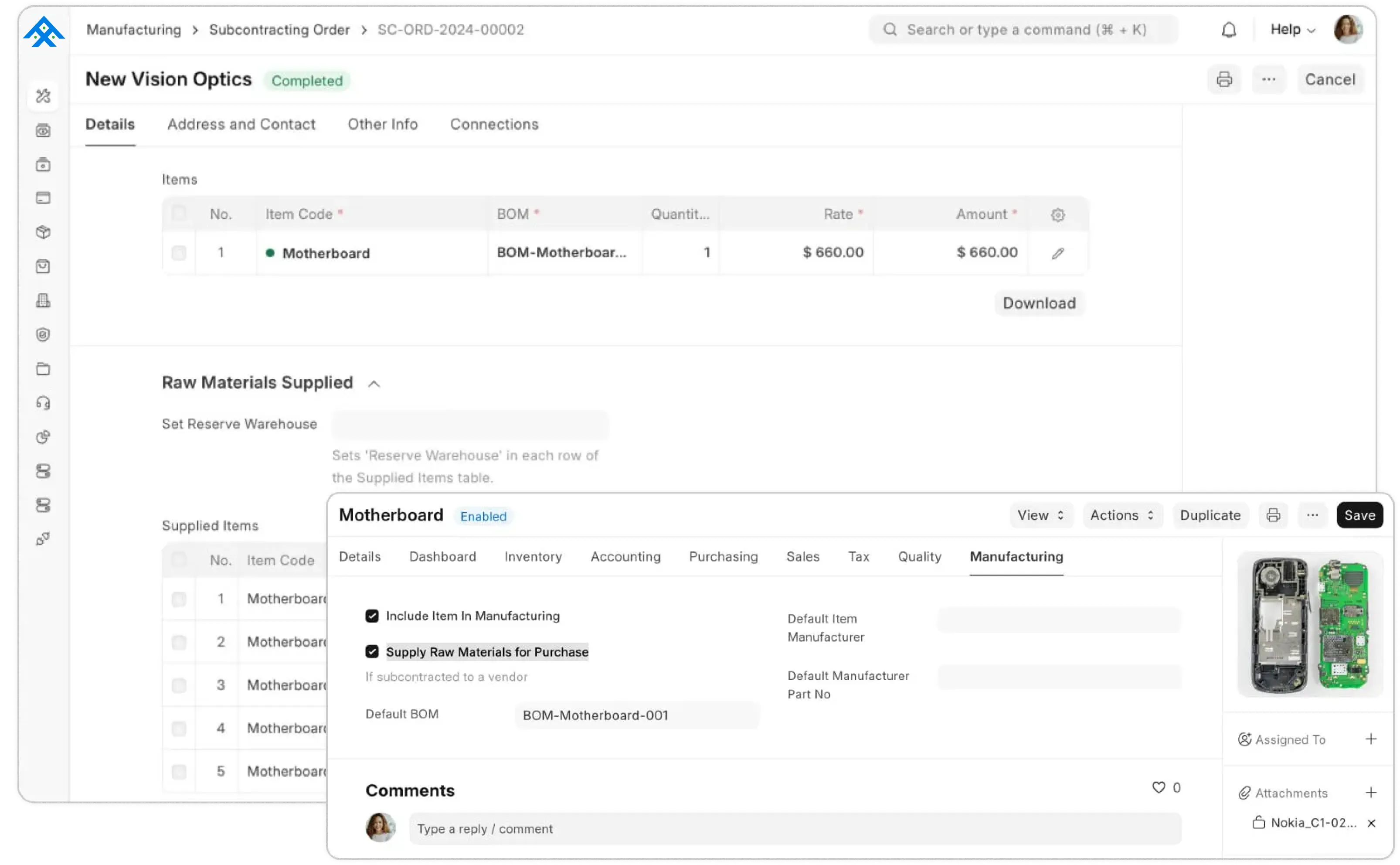 Track BOMs, plan production, and prevent material shortages with ERPNext’s Manufacturing module. Ensure smooth operations through automated quality checks, timely material planning, and accurate backflushing.