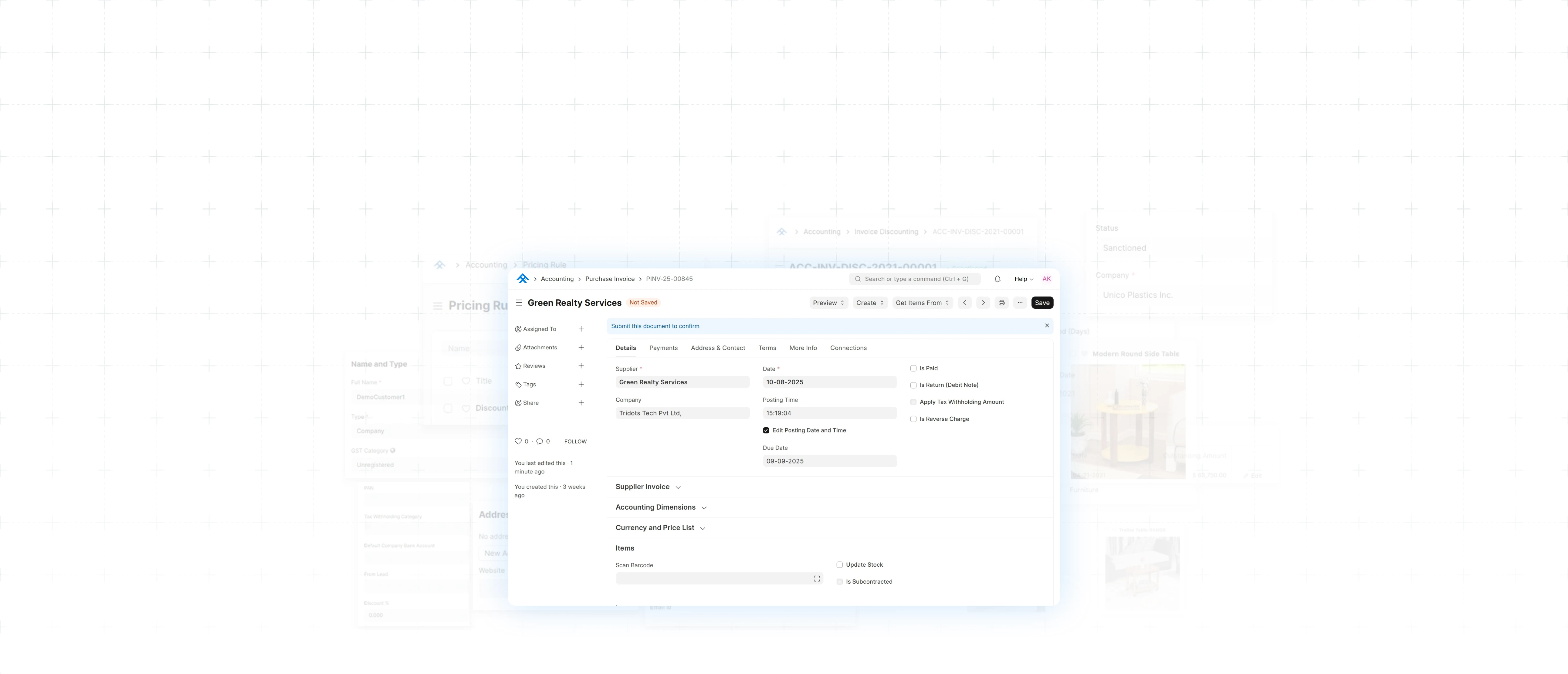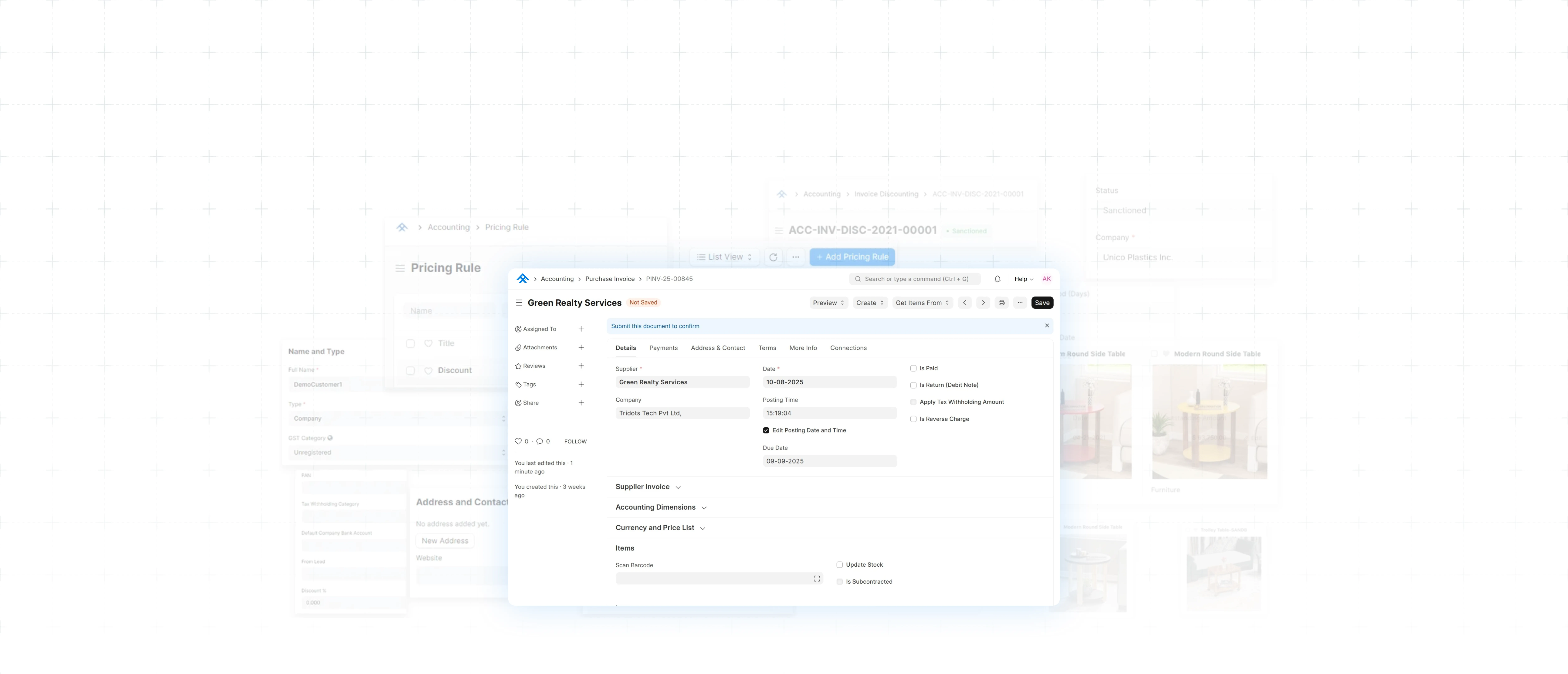 Get custom templates for quotations, purchase orders, sales invoices, delivery slips, etc.