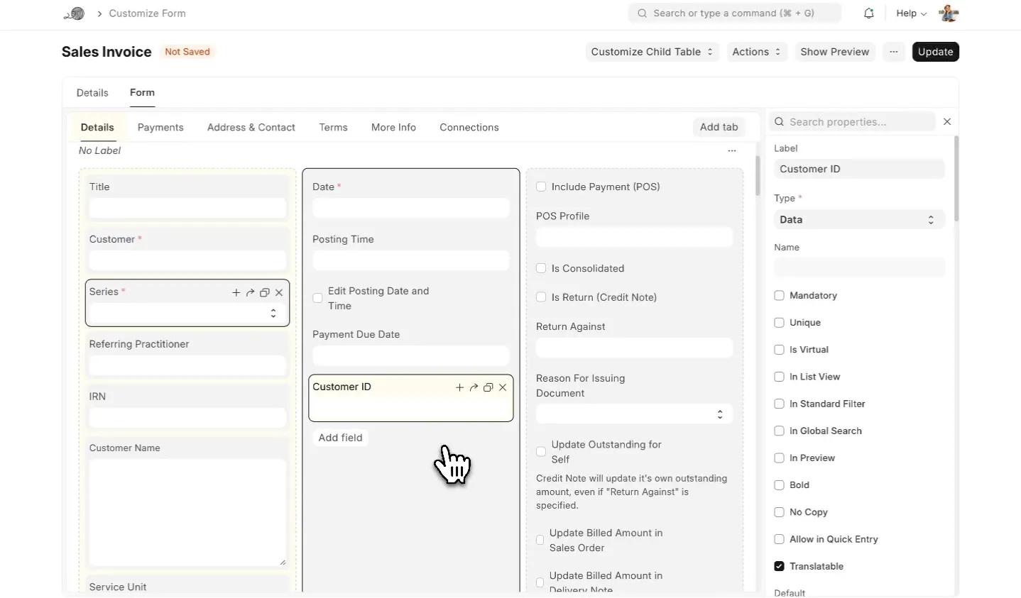 Use Doctype Designer to add fields, change layouts, and update properties—no coding needed.