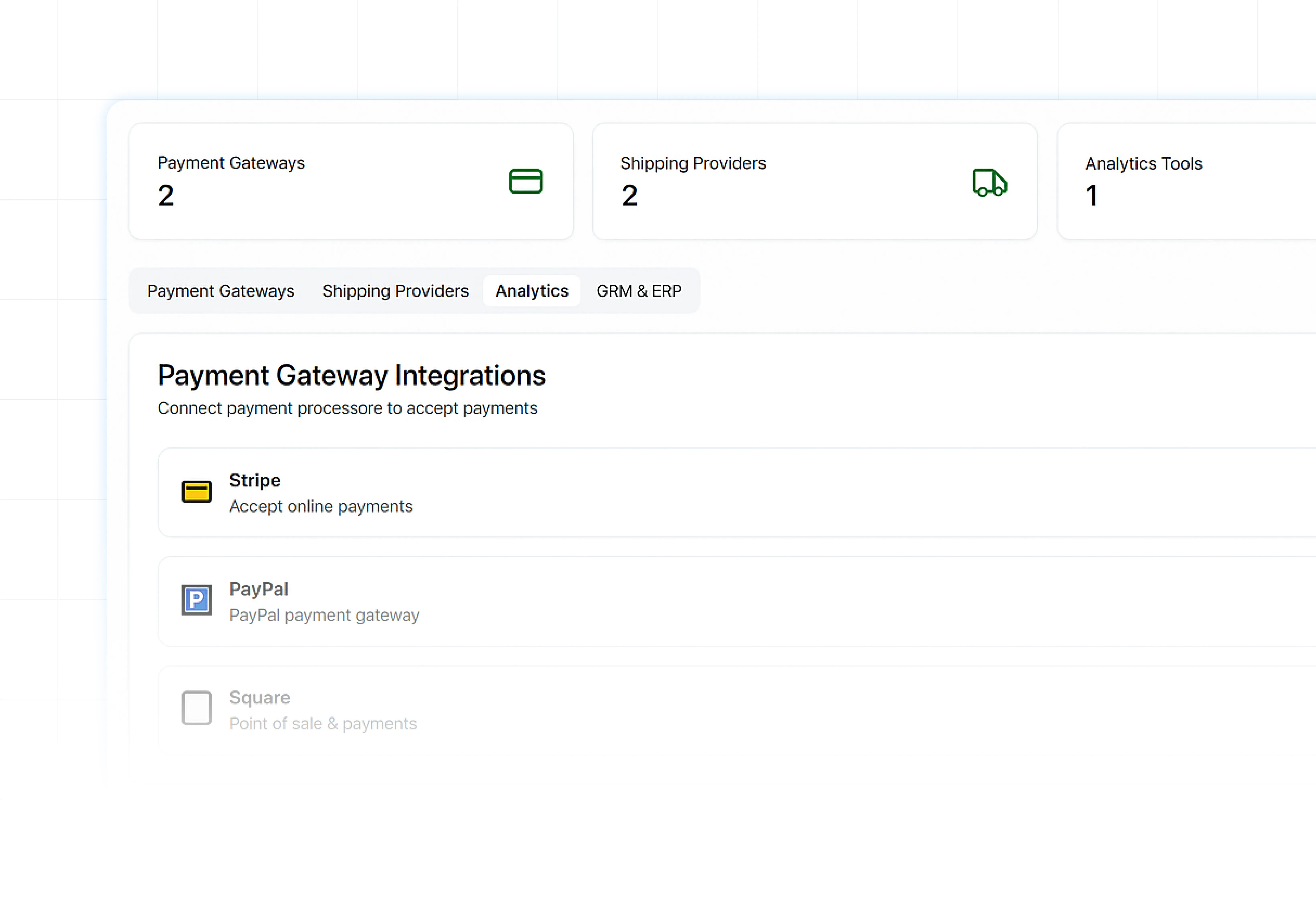 Integrate Razorpay, Stripe, UPI, COD, and more.