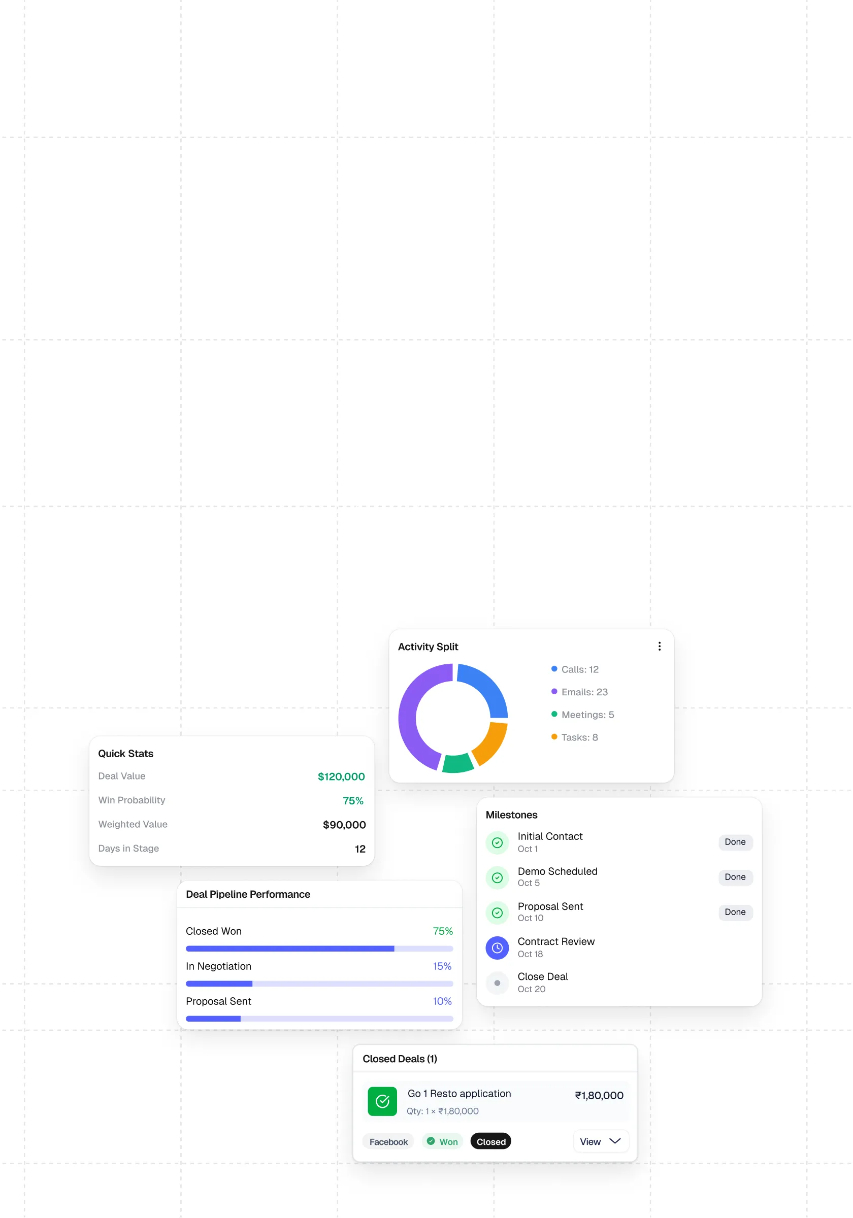 Every interaction related to a deal—calls, meetings, notes, tasks, and follow-ups—is recorded in one unified timeline.