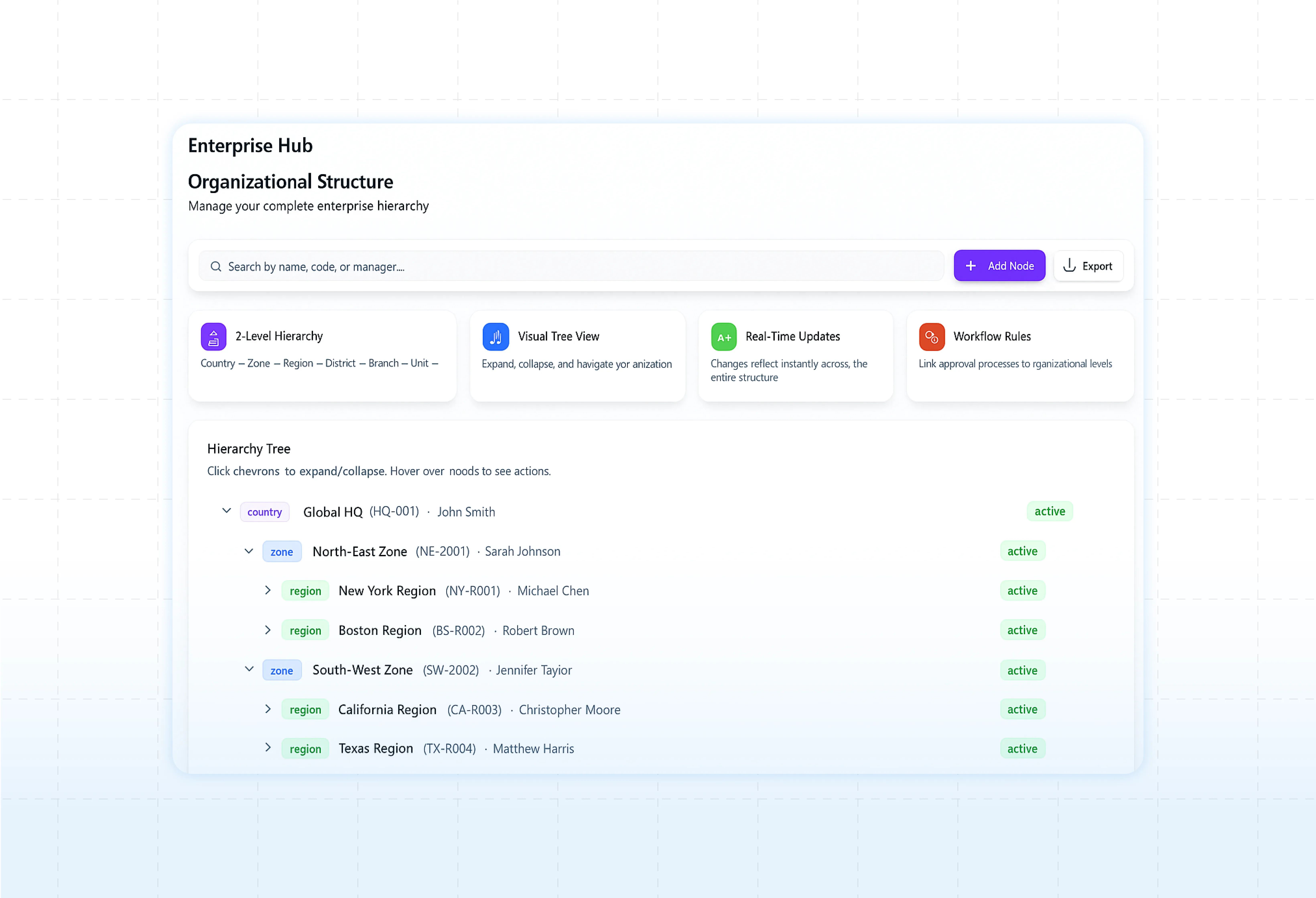 Add new branches, zones, or departments as you grow.