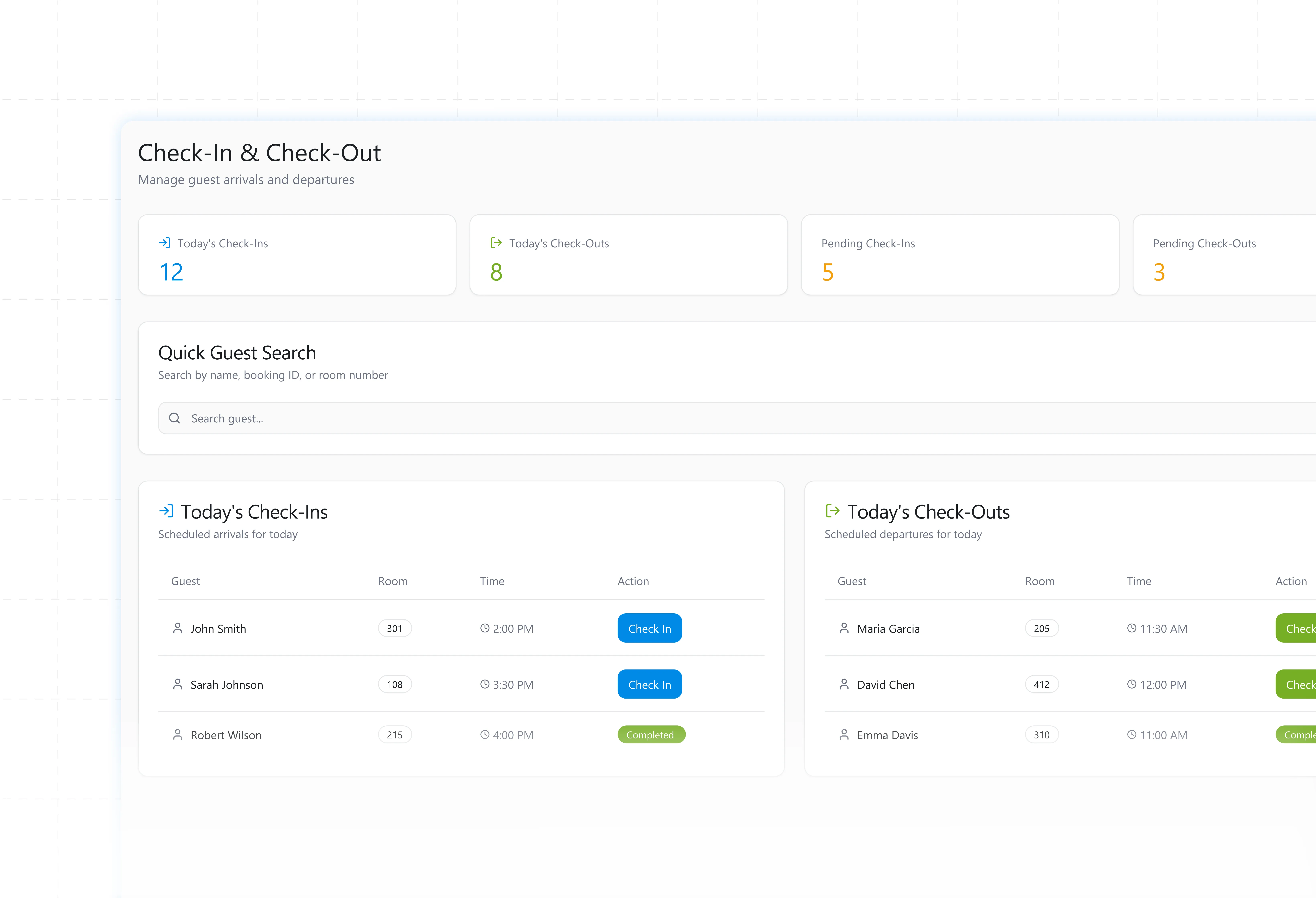Monitor guest check-ins and check-outs in real time.