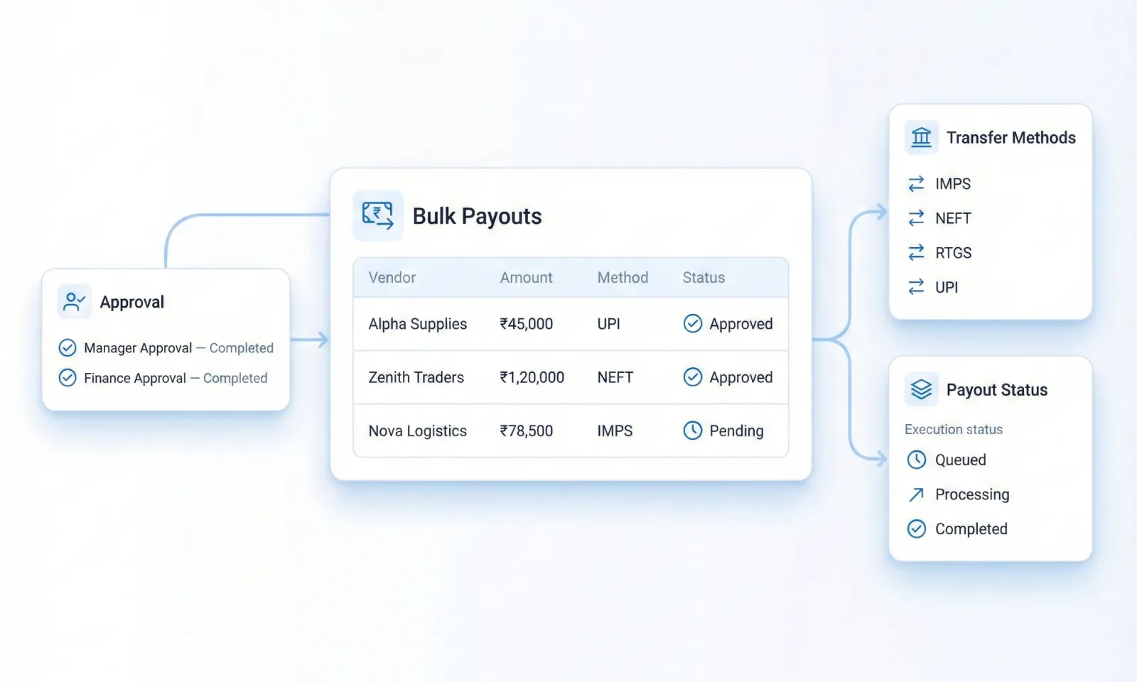 Automate vendor and bulk payouts from ERPNext using integrated payment gateways like RazorpayX and Stripe.